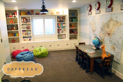 After that, the family tucked an under‑the‑stairs playroom behind a sliding barn door—so the living area stays tidy while kids get a space of their own. Inside, more white built‑ins and gray‑and‑white stripes keep things cheerful and organized. Display favorite toys and picture books in open‑face shelves; they double as wall art.