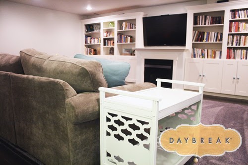 Next, the Hewletts added a mint‑green beverage cart for effortless entertaining and installed crisp white built‑ins for a custom look.